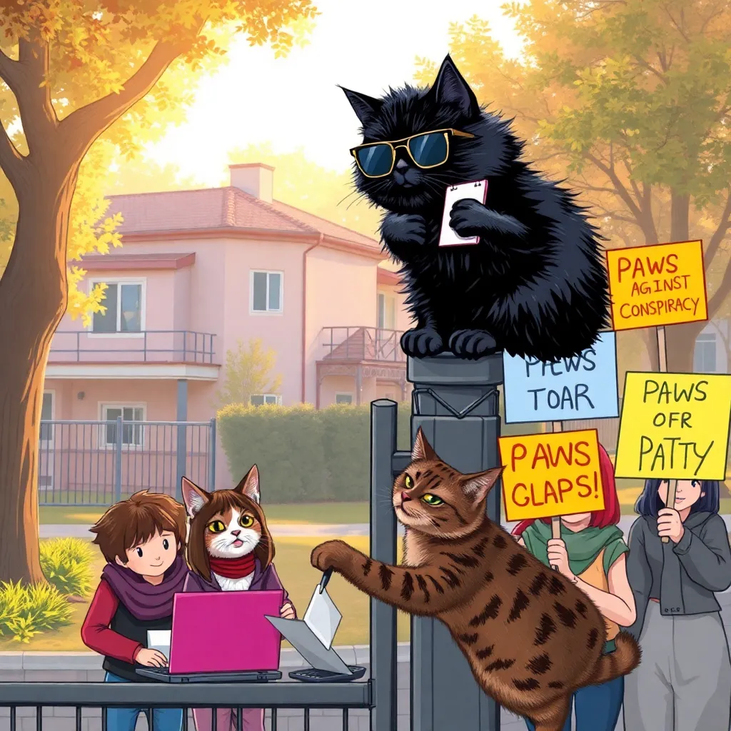 Além disso, à medida que o sol rompeu as nuvens sombrias no segundo dia deste debate, gatos e humanos se juntaram às ruas para um protesto pacífico. Cartazes com os dizeres “Gatos Contra a Conspiração” e “Patas Fora da Nossa Privacidade” adornavam o parque, exibindo a unidade da comunidade diante de uma ameaça imaginária.
