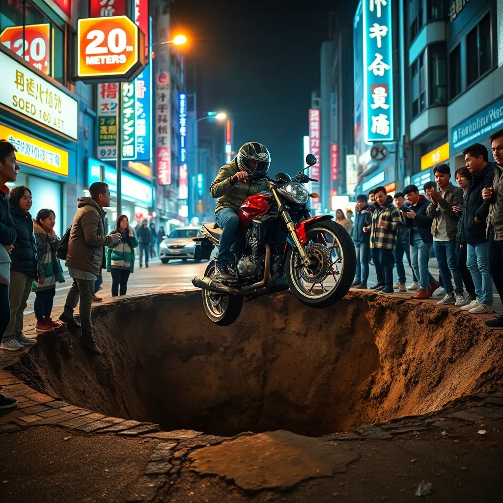 Seul, Coreia do Sul - Em uma noite de segunda-feira aparentemente comum, um motociclista em Seul se viu testando os limites da gravidade quando um buraco de 20 metros de largura se abriu sob ele. O incidente levou muitos a se perguntarem se as estradas de Seul estão secretamente fazendo teste para um papel em um novo filme de ação intitulado Velozes e Furiosos: Descida ao Submundo.